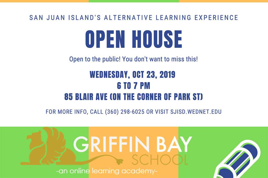 San Juan Island School District’s Alternative Learning Experience is hosting an open house. Learn more about Griffin Bay School, San Juan’s online learning academy, from 6-7 p.m., Wednesday, Oct. 23, at 85 Blair Ave. For more information, call 360-298-6025 or visit sjisd.wednet.edu.