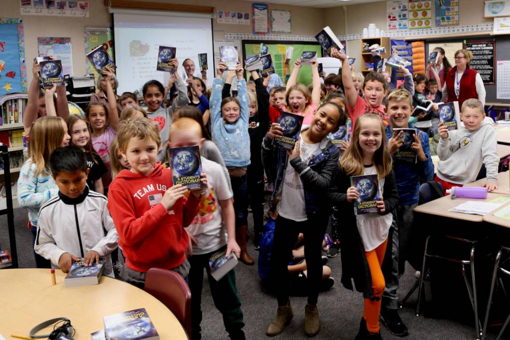 The Rotary Club of San Juan Island recently visited the Friday Harbor Elementary School for its annual distribution of dictionaries to third-, fourth- and fifth-grade students. The kids are excited to receive a dictionary of their own. Rotary has given over 3,000 dictionaries and thesauruses to students countywide for over 11 years under the leadership of Literacy Chair Barb Fagan. As computers have entered the classrooms, we remind them, when your computer is down, your thesaurus and dictionary are still up and running!