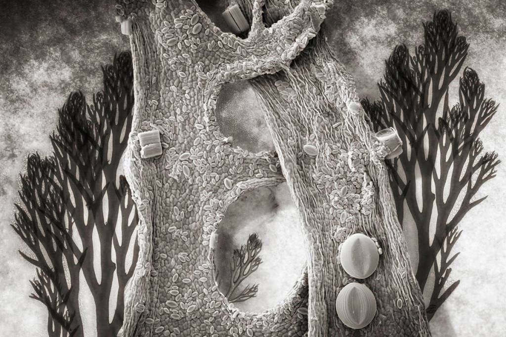 A recurring challenge has been: how to visualize complex ideas (the beauty of textures and patterns, climate change impacts, metaphor and fact) in the confines of a single image? I settled on photomontage, where I create a surreal conversation between the life-sized version of an object and microscopic parts of itself.