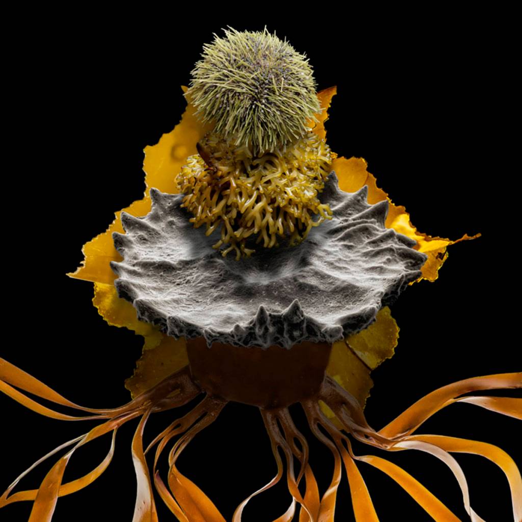Ranna and I are avid snorkelers, and one of our favorite cliffs showed a marked increase in green urchins this past summer. Given the importance of kelp to the Salish Sea ecosystem and the implications of seastar wasting disease on urchin predators, this was a valuable topic to pursue. The fact that both urchins and kelp are eaten by people gave that an added level of relevancy for my Food for Thought exhibition. Among other items, this image combines a micrograph of the green urchin tube foot (“platter”), bull kelp holdfast and kelp blades with urchin teeth marks.V