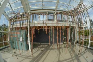 Looking up through this art installation, we are presented with the illusion of being submerged amidst the kelp, underwater. Changing light throughout the days alters the mood of this very tactile art at the San Juan Islands Museum of Art. We are challenged by the installation “Tide of Transition,” designed by Cathryn Mallory of Missoula, Montana. She intends for the Atrium to be a space for reflection on the beauty and function of marine plant forms of the Pacific Northwest.