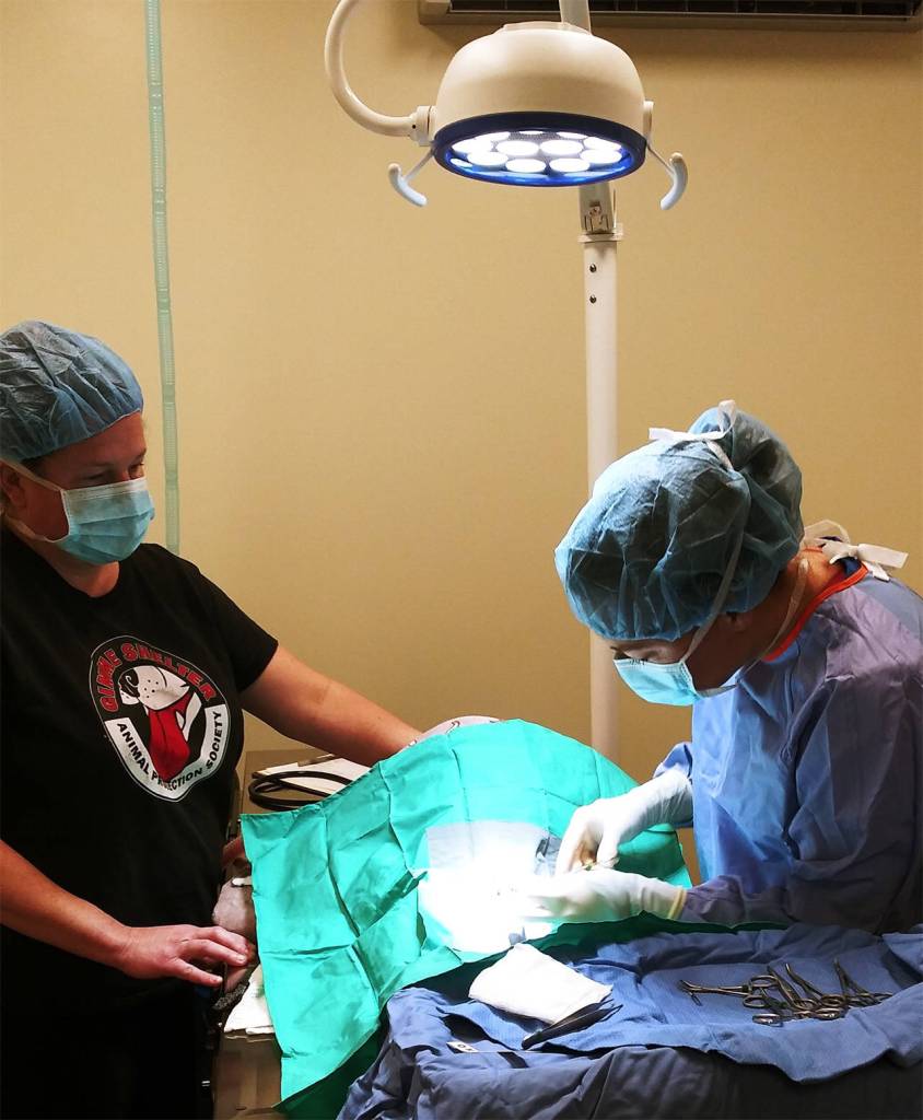 The Animal Protection Society of Friday Harbor held its first surgeries in the shelter’s newly completed surgical auite on Wednesday, Feb. 5. Two successful neuters were performed back-to-back by APS-FH veterinarian Dr. Merriss Waters with assistance by APS-FH Lead Animal Care Technician Dyan Shober. The two young dogs, “Monkey” and “Mr. Magoo,” are recovering well.
