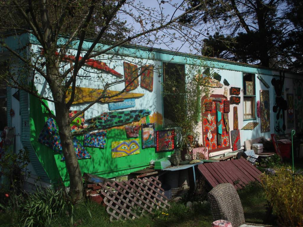 I’ve been fascinated by Simeon LaRiviere’s place ever since I started walking past it on my way out to Terrace Drive. (Incidentally, the public part of Terrace Drive goes up a long hill if you’re looking for a workout.) Simeon’s folk art, a colorful mosaic of shapes and patterns painted on every conceivable surface, is attached to the outside of his mobile home in the Harbor Ridge community just off Roche Harbor Road.
