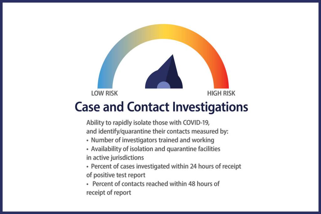 The fourth dial measures the state’s ability to conduct case and contact investigations and quickly act to isolate and quarantine those affected.