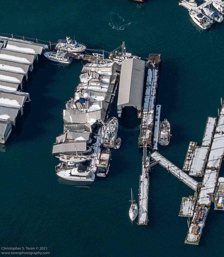 Port of Friday Harbor’s Executive Director Todd Nicholson explained that the weight of the snow caused the timber to split in one boathouse and the roof structure collapsed from the strain. When the first one collapsed, it created a domino effect, and one after the other roof fell into the boats below, causing them to sink down into the water. Nicholson verified that in total, all 10 boatsheds were affected, and eight boats remained under the collapsed roofs.
