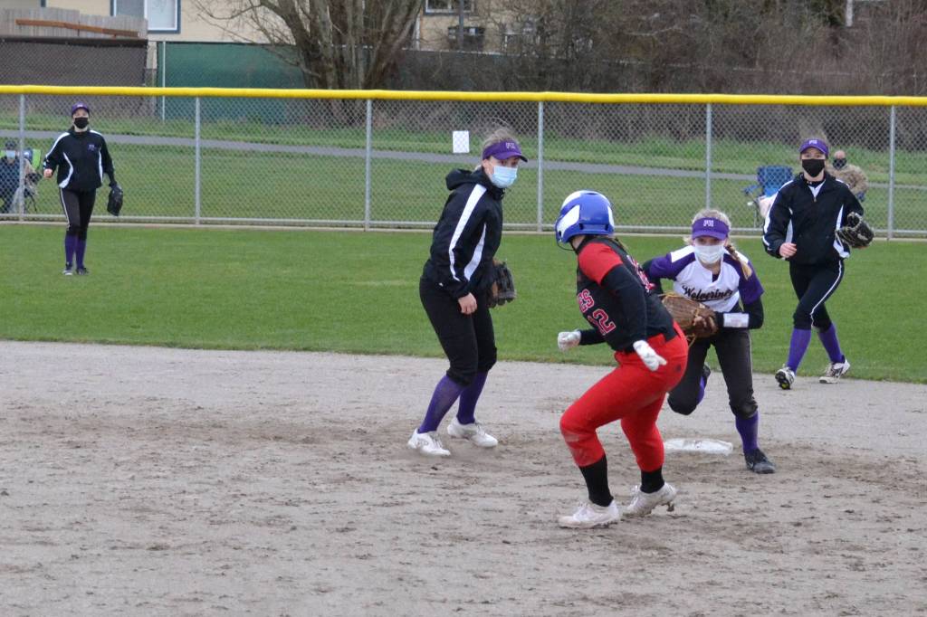 Senior Darcy Ayers about to tag runner to second base against Coupeville on March 19. The girls lost 8-3 at home against the Wolves. (Jennifer Ayers/contributed photo)