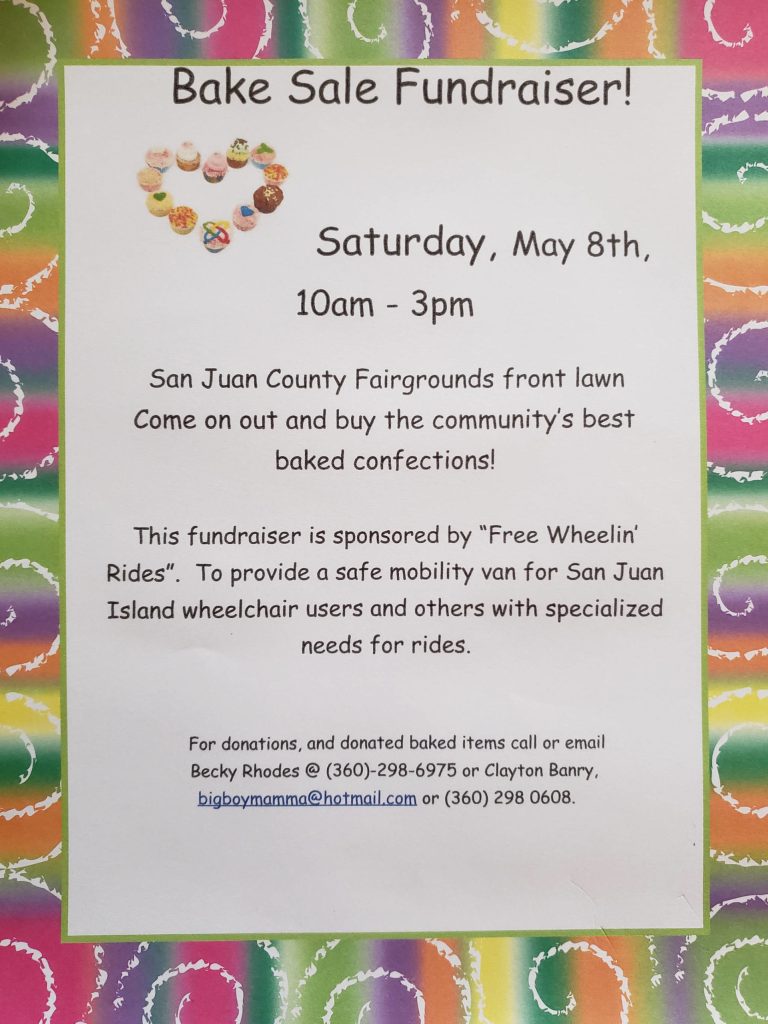 This bake sale fundraiser, sponsored by Free Wheelin’ Rides, is to provide free transportation needs for wheelchair users and others with specialized needs for rides around San Juan Island. If you would still like to donate baked goods for the bake sale you can drop them off from 5-7 p.m. at the fairgrounds on Friday, May 7, or call Becky Rhodes at 360-298-6875 or Clayton Banry at 360-298-0608 to make arrangements.