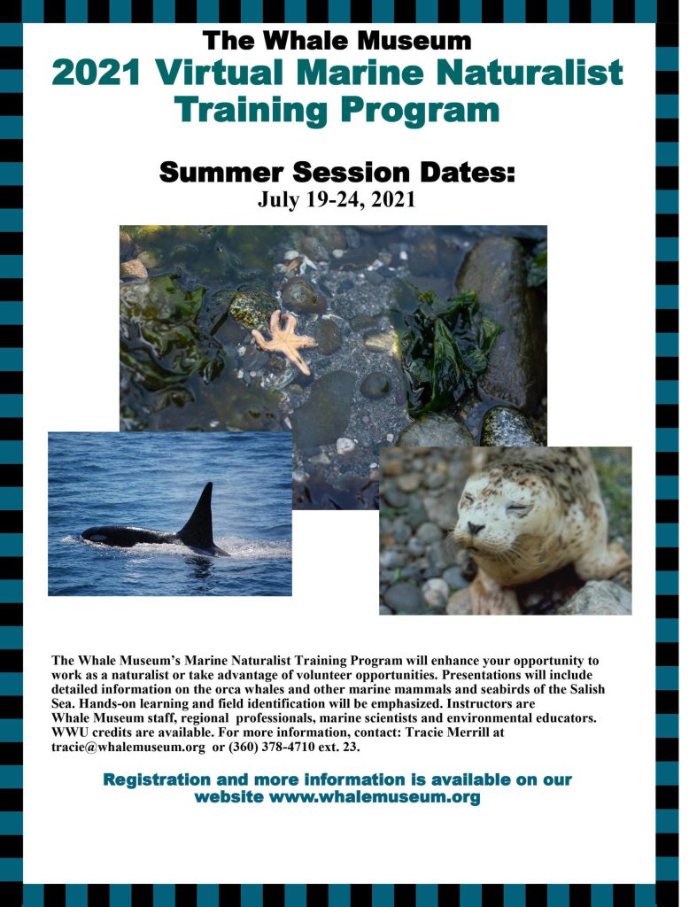 Registration is now open for a summer virtual session of The Whale Museum’s Marine Naturalist Program. This dynamic and high-quality program will be six sessions and run on the following dates: July 19-24. The objective of this program is to provide a learning experience that assists adult graduates in becoming qualified regionally as professional or volunteer naturalists.