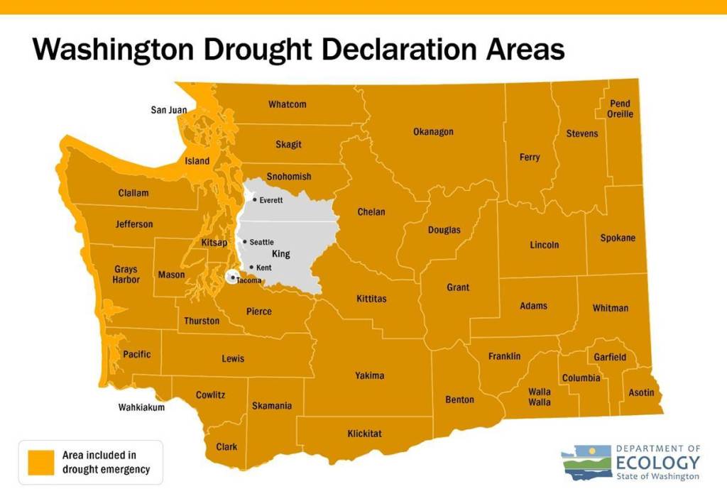A historically dry spring and summer, followed by a record-breaking heatwave have affected water supplies across Washington, prompting the Washington Department of Ecology to issue a drought emergency for most of the state. The only areas excluded from the emergency declaration are Seattle, Tacoma and Everett.