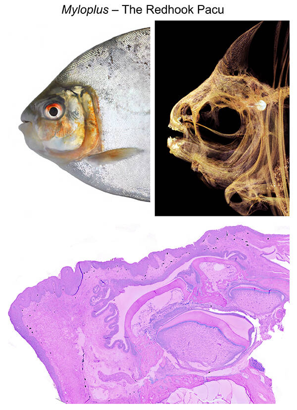 Pacus, the herbivorous cousins of notoriously carnivorous piranhas, have large multi-cuspid teeth that are hidden by large lips analogous to the tongues and snoots of giraffes and rhinos (Cohen and Kolmann, 2021). Using plastic histology, I sectioned the lips of the pacus to find that they are not muscular like those of mammals, but are instead composites with layers of collagen, fat and keratin (the material that makes up our fingernails). Sometimes it’s important to not just see the morphology and arrangement of tissues but also know their identity. This is where paraffin histology comes into play. It revealed that some of the soft tissue in pacu lips is elastin: a protein responsible for stretchiness.