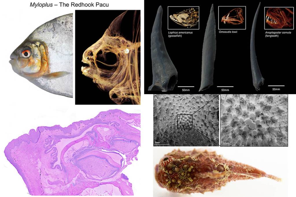 Teeth and armor are inherently 3-dimensional structures, as they interact with food and the environment from many directions. 3D problems require 3D solutions and analyses; CT scanning lets us see reconstructed anatomy in high resolution without the artifacts created by dissection. The teeth I study are small. Really small. For instance, a single tooth of a bristlemouth fish — the most abundant vertebrate on the planet — is 30 microns thick, which is thinner than a strand of hair. CT scanning allows me to see these important feeding structures from a whole new point of view, and 3D print them 200% larger than they are in life. Doing this enabled me to show that not all small, pointy teeth work in the same way and that these seemingly simple dentitions are more complicated than the considerations of a single tooth. Curved teeth in the goosefish are used to puncture and hold onto prey, and the exaggerated teeth in the fangtooth fish effectively “cage” prey inside the mouth to prevent prey from swimming away (Cohen et al. 2020).