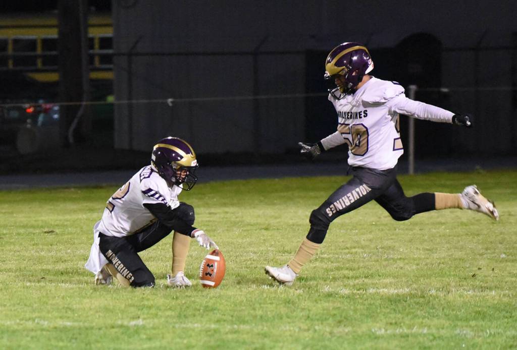 Wolverine Victor Velasquez #50 kicks another point after touchdown. (John Stimpson photo)