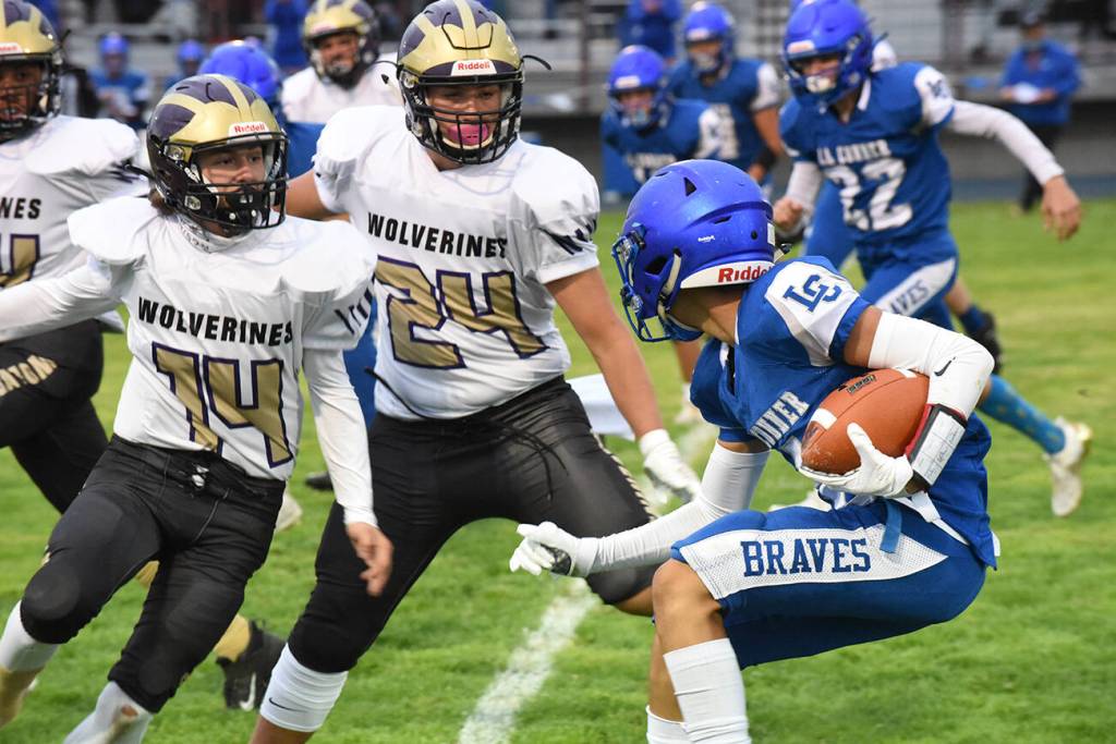 Wolverine Dylan Roberson #7 and Max Field #65 tackle the Braves running back. (John Stimpson photo)
