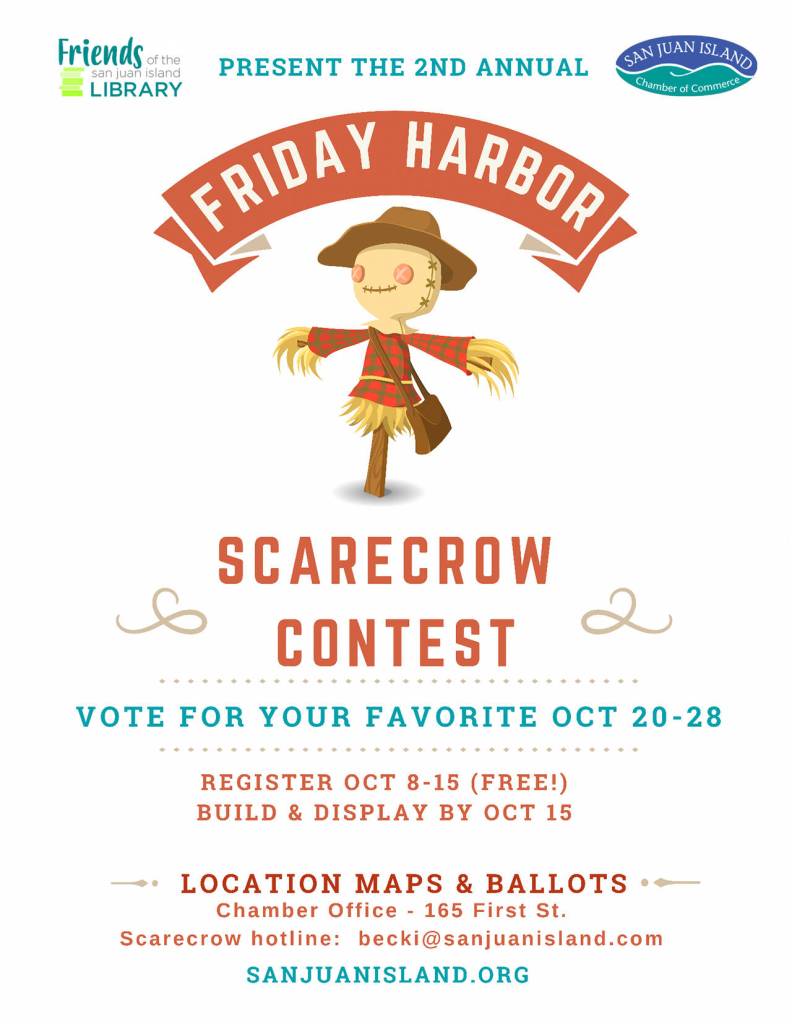 The San Juan Island Chamber of Commerce and the Friends of the Library are sponsoring the second annual Scarecrow Contest for the month of October. The scarecrows are to be registered with the Chamber and in place between Oct. 8-15. Fill out the form at chamberorganizer.com/sanjuanisland/docs/Scarecrow_Contest_Registration.pdf to register.