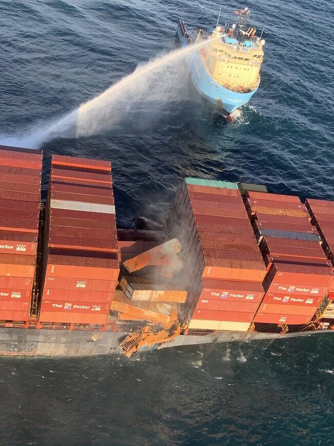 On Oct. 23 at 11 a.m. the Canadian Coast Guard responded to the container ship M/V Zim Kingston, which had come from South Korea. The fire is suspected to have started from damaged goods being transported in one of the containers, leading to ten more catching fire. The fire has since been contained, but salvage contractors are still seeing evidence of fire in some of the containers. CCGS Captain Goddard M.S.M and the tug Seaspan Raven stayed to monitor the situation. So far, 109 containers have been reported to have fallen overboard.