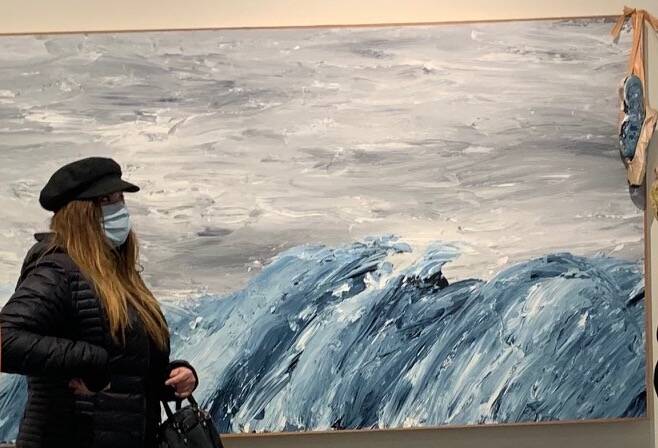 When you visit be sure to spend some time viewing the work of artist, Jennifer Jones. Jones resides on Orcas Island and is exhibiting her work for the first time at SJIMA. Her work, J-2, depicts a deep blue-grey turbulent seascape. The work is on a large canvas, 48” by 96,” and is embellished with a pair of worn ballet slippers hanging off one corner. The soles of the slippers are covered in the blue-grey colors seen on the canvas. There is a surprising reason for this. Jones painted the piece entirely in ballet slippers as part of a five-piece series done in a similar manner.