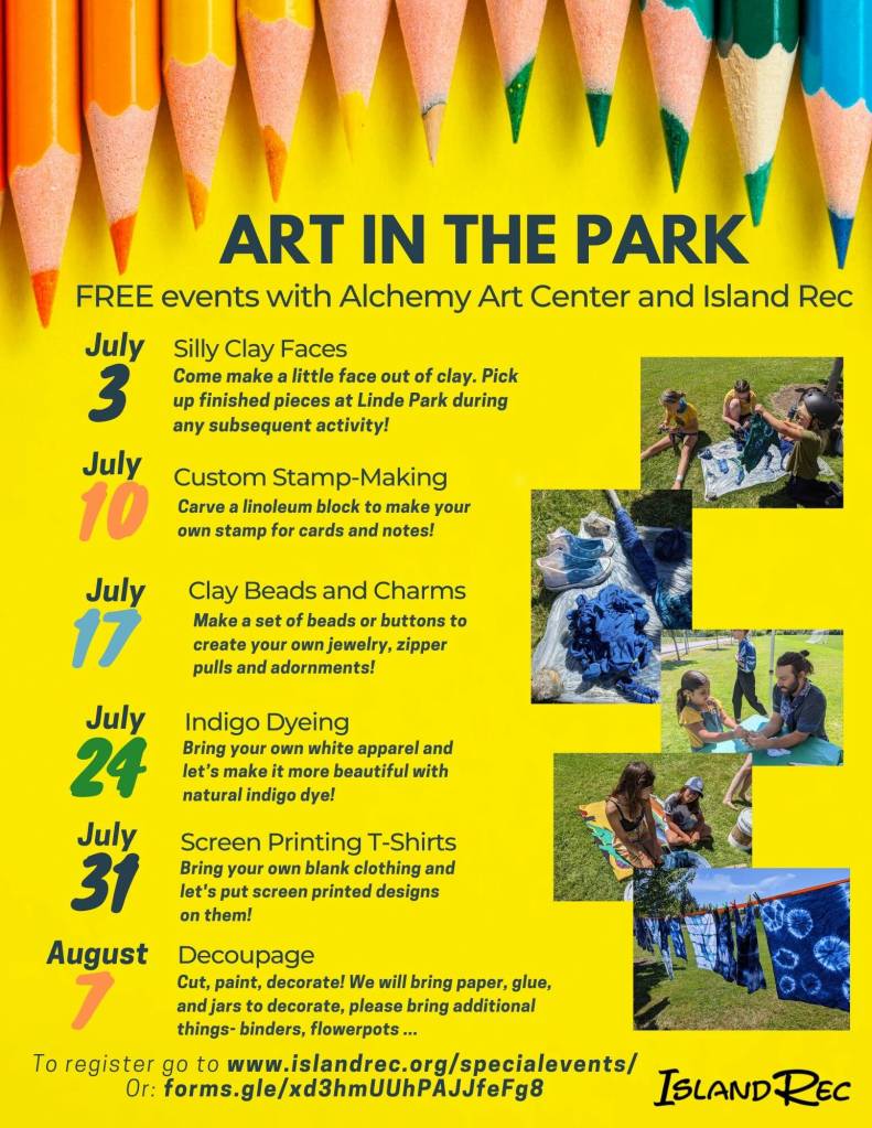 Join us for some weekend fun and creativity! Island Rec will once again be setting up a free arts and crafts booth at the Farmers Market. The always popular tie-dying will be on June 11th. White t-shirts will be available at $5 each.