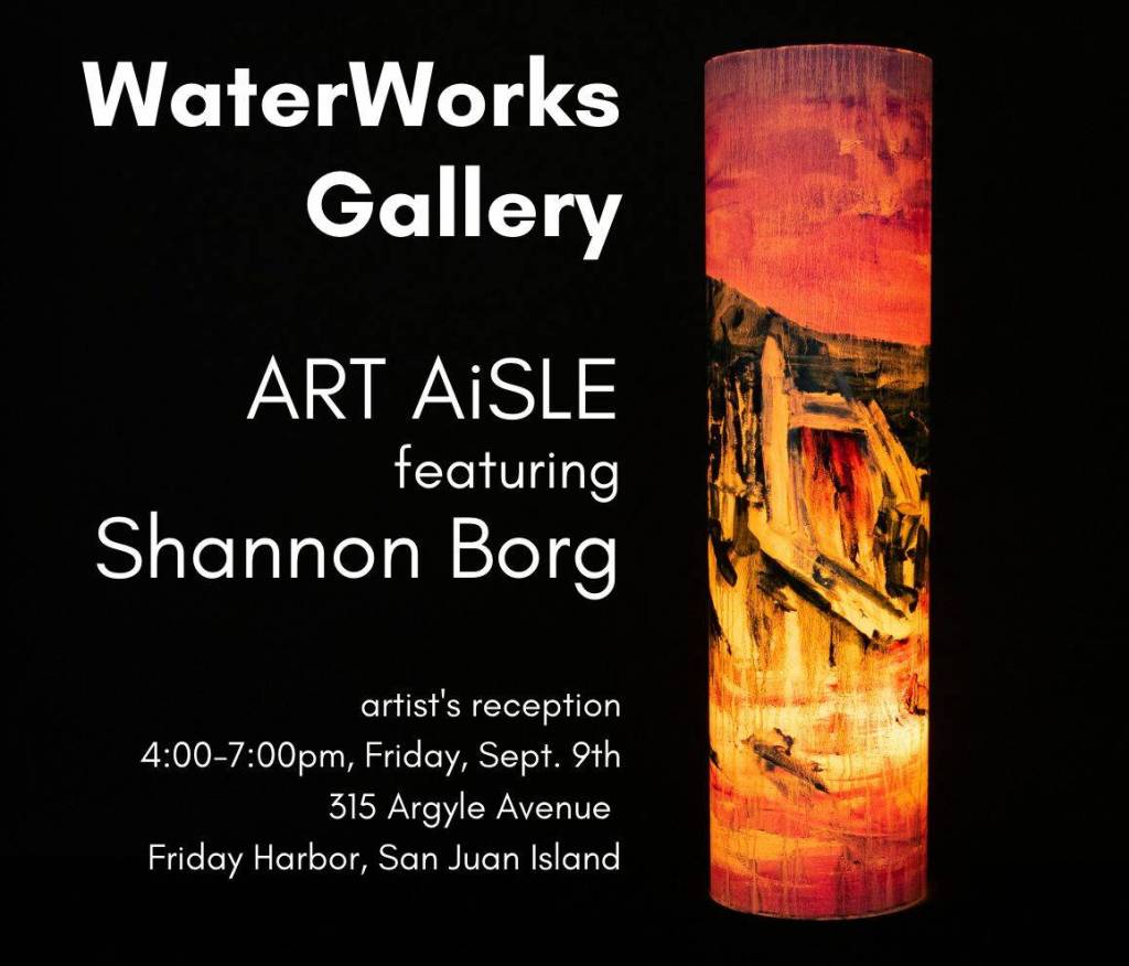 Borg has created a new type of original oil painting – a ‘Lunaria’ – a tube of stiff paper that stands like a lamp, and can change colors, to capture the light of the beach at different times of day – and different colors of the imagination. Read more about her process in her blog post “The Accidental Lunaria.” (https://www.shannonborg.com/blog/lunaria-paintings-waterworks-gallery)