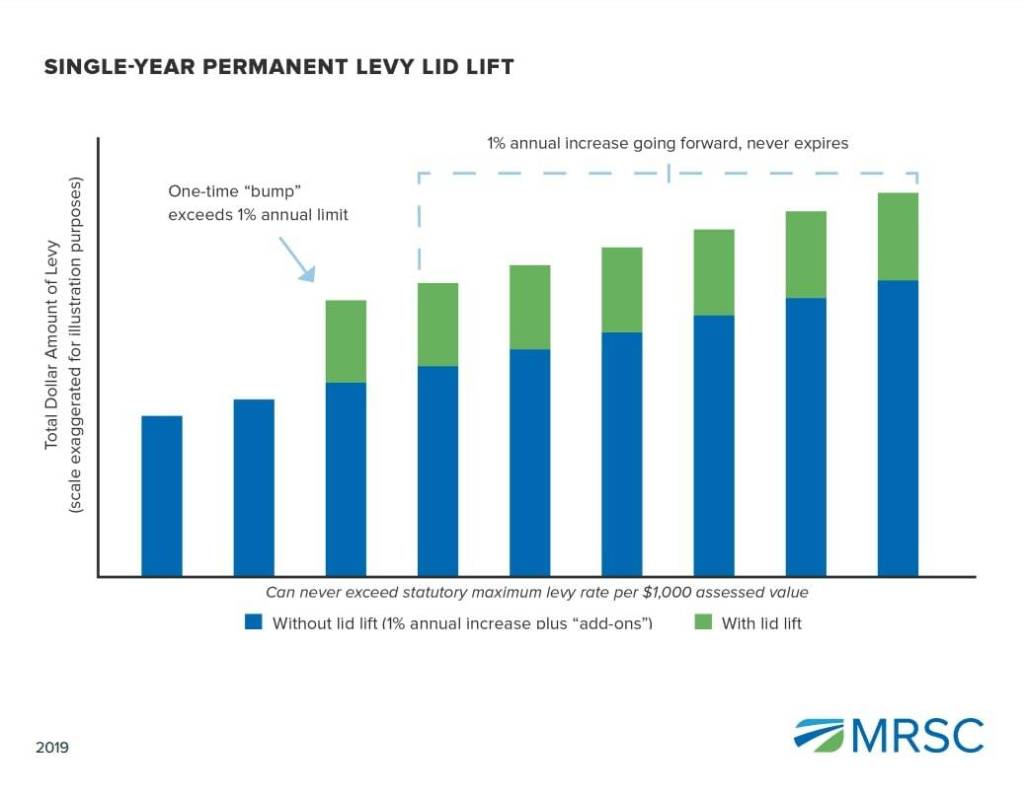 A: With a permanent single-year lid lift, the levy lid bumps up more than 1% in the first year, and then that amount is used to calculate all future 101% levy limitations. The measure never expires, and the levy lid never reverts. However, future annual increases may not exceed 1% without going to the voters for another lid lift.