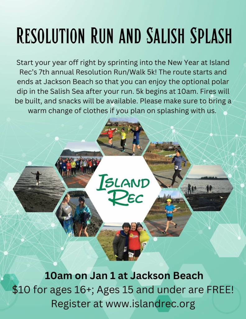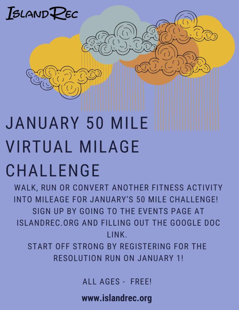 Walk, run or convert another fitness activity into mileage for January’s 50-mile challenge! You can track your distance using your smartphone, watch or any available app (Strava, Map my Fitness, Fitbit, Nike Running, Garmin) Sign up by going to the events page at islandrec.org and filling out the google doc link. Start off strong by registering for the Resolution Run on January 1! Jan. 1 – 31 FREE!