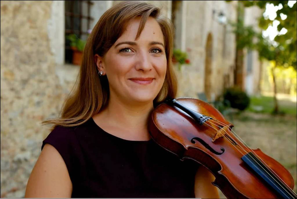 Lindsey Strand-Polyak plays a viola made in about 1720 in England with a bow like those played in the early 19th century.