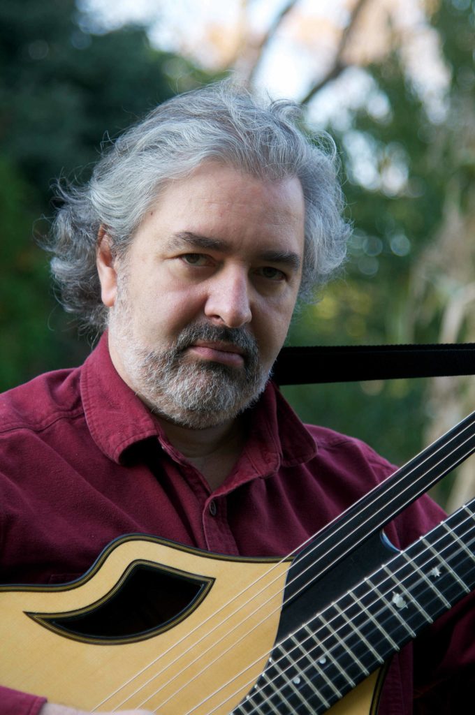 Oleg Timofeyev’s instrument was made in Russia by an anonymous builder in about 1820. The seven-string guitar was born on Russian soil as a hybrid product of the Spanish guitar (the familiar one) and the cittern called “the English guitar” that was brought to the Russian Empire by the Czechs and Poles. But the actual figure-eight-shaped instrument equipped with seven strings tuned to a G major chord has only been played in Russia, Poland, and various Soviet Republics, from Georgia to Estonia. Oleg Timofeyev is the 7-string guitar’s premier expert in North America.
