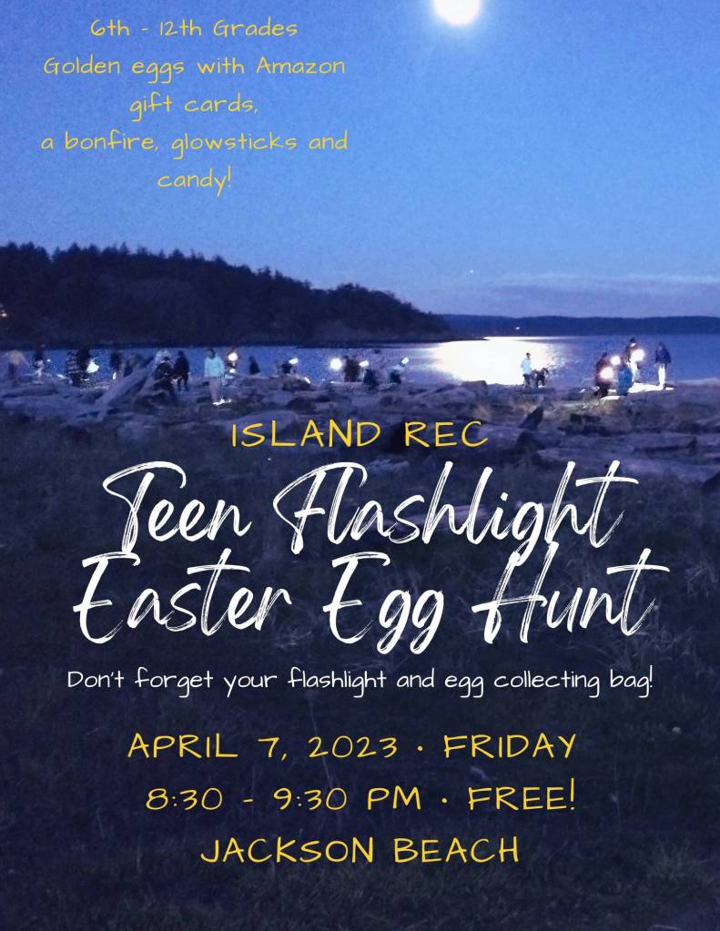 If you thought looking for Easter eggs was kids stuff, try finding them in the dark, amongst the logs at Jackson beach! Find the golden eggs and receive prizes like Amazon gift cards and candy! All teens grades 6 – 12 are welcome at this free event! Friday, April 7, from 8:30-9:30 p.m. at Jackson Beach. Don’t forget a flashlight and hunting bag!