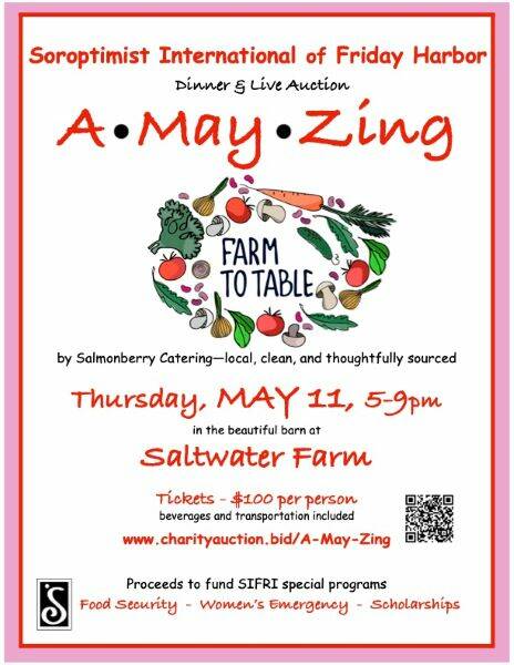 Soroptimist International of Friday Harbor invites everyone to its A-May-Zing annual fundraiser at the lovely Saltwater Farm on May 11 at 5 p.m. The event supports essential programs that help women and girls in our community, including educational awards and scholarships, food security and a women’s emergency fund. Learn more about SIFRI’s programs here: https://www.sifri.org/programs.