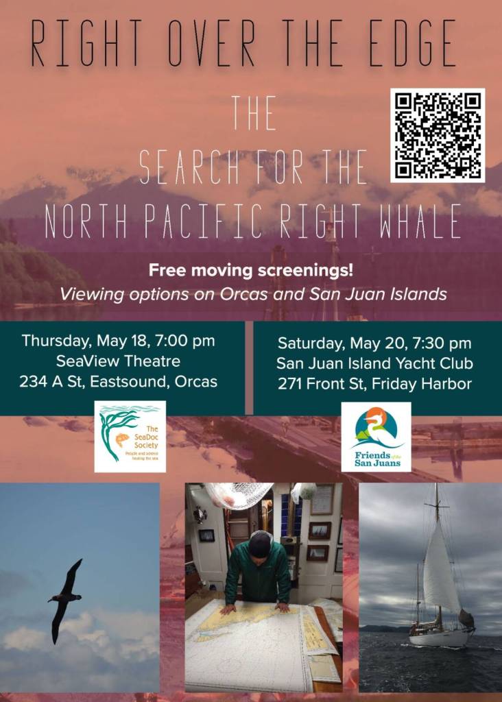 North Pacific Right Whales are so rare that even the foremost experts on the species are lucky to see one or two in their lifetime. A comment period to help conserve the species is expected to open up this Spring. Right Over The Edge debuts with the return of SeaDoc Society’s popular Ocean Night series at the SeaView Theatre in Eastsound, Thursday, May 18 at 7 pm. The second showing is in partnership with Friends of the San Juans and the San Juan Island Yacht Club in Friday Harbor, Saturday, May 20 at 7:30 p.m.