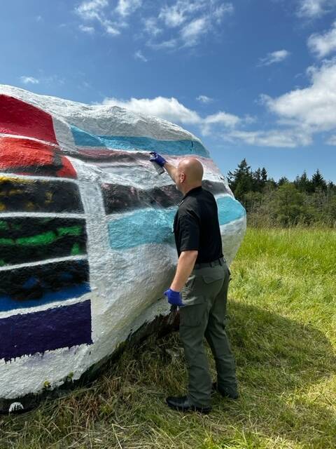 Early in the morning, someone had covered the ugly words over with black, but by two that afternoon, between six to a dozen community members had repainted the flags with paint donated by Brownes Lumber. The original spray paint was donated by Ace Hardware.