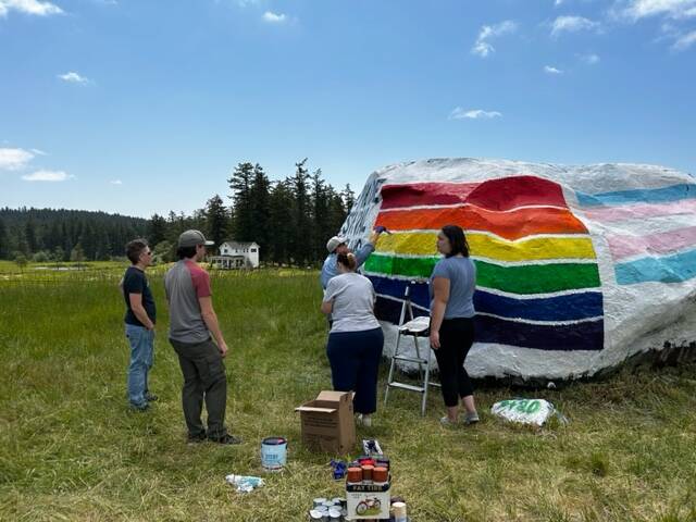 A group of young islanders painted The Rock, located on property owned by Lake Edna Estates HOA, Friday, May 26, displaying the date and time of the festival, along with both a Pride and Trans Flag, and finished it off with their hand prints.