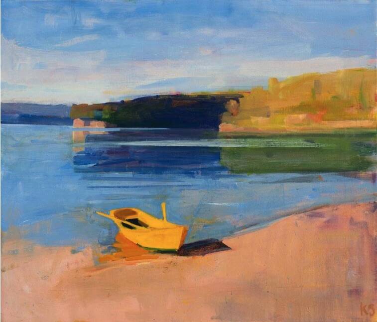 “We love the things we love for what they are.” A simple line written by poet Robert Frost that speaks volumes about the power of those unfailing, familiar things that are the bedrock of our lives. This love for ordinary, everyday moments and the grandeur of the familiar is at the core of Bays and Tides: a Painterly Vision, a collection of paintings by Kurt Solmssen, in the Nichols Gallery. In his luminous plein-air (painted outdoors) paintings we are treated to scenes that convey the small, sweet moments of family life and the grandeur of our PNW coastal light. The 23 paintings are grounded in a strong sense of place that speaks to Solmssen’s deep understanding of his landscape. We see the people and places that make up the elemental microcosm of Solmssen’s bayside life. The soothing sway of a hammock in dappled shade, teacup reflections cast on a table, oars leaning against a cedar trunk, a glass vase holding gold forsythia, and a patiently waiting rowboat on the beach: small details cumulatively conveying life’s largesse.