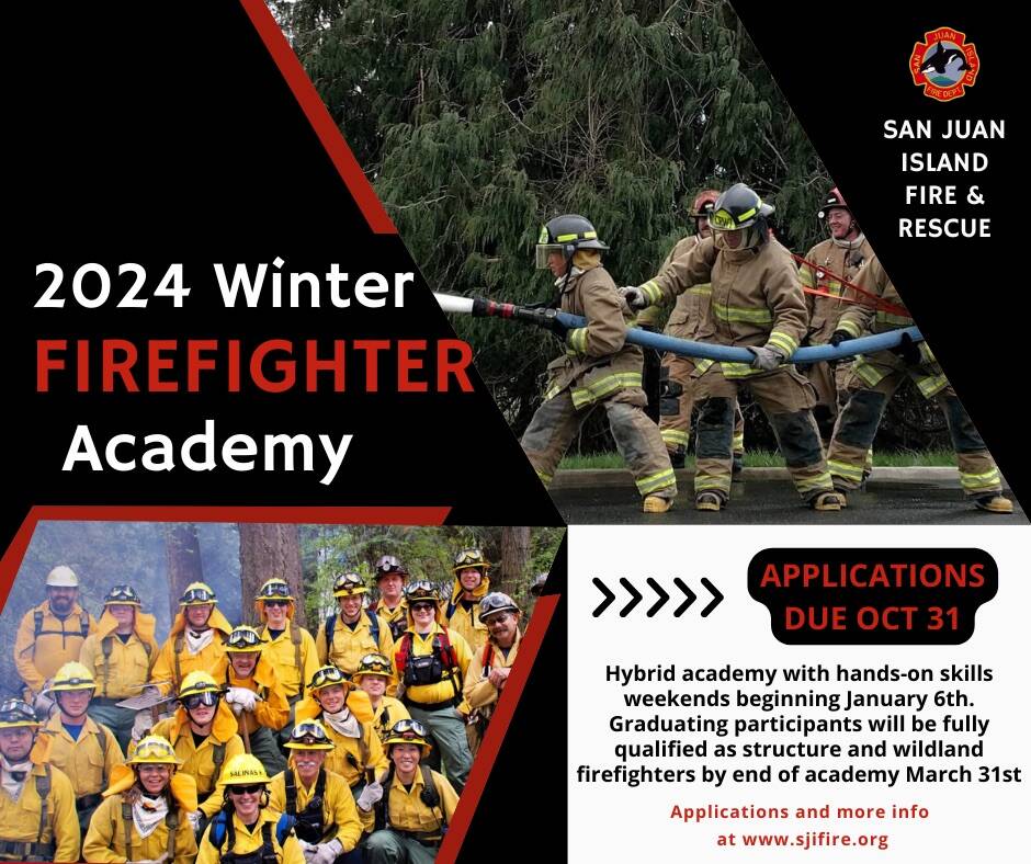 San Juan Island Fire & Rescue is excited to announce the upcoming 2024 Structure/Wildland Firefighter Academy. This hybrid format with allow partial self-paced bookwork with hands-on skills weekends beginning January 6th. Graduating participants will be fully qualified as structure and wildland firefighters by end of academy March 31st, 2024.
