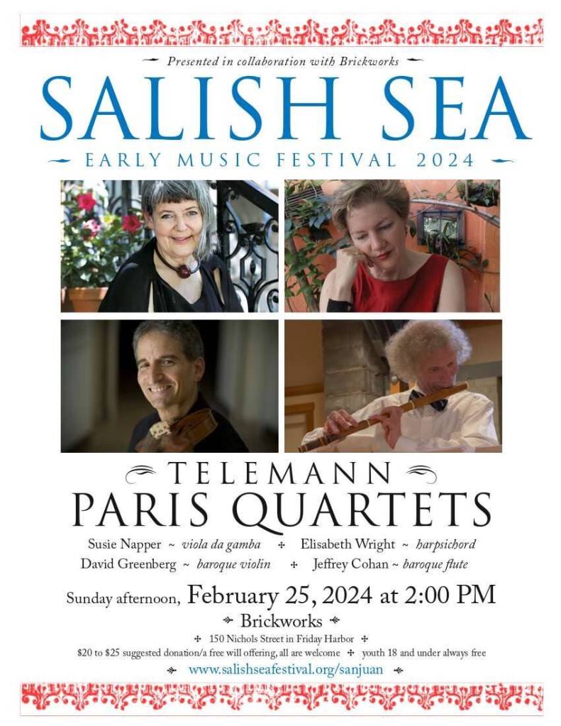 This Sunday afternoon at 2 p.m. at Brickworks, Telemann’s brilliant “Paris Quartets” are to be celebrated in this third program of the 2024 Salish Sea Early Music Festival featuring violinist David Greenberg, harpsichordist Elisabeth Wright, viola da gambist Susie Napper and baroque flutist Jeffrey Cohan. Telemann, one of the most prolific and influential composers of all time, composed his vibrant “Paris Quartets” in Hamburg and then Paris in response to a request in 1730 from the most famous Parisian flute, violin and cello virtuosi and resulted in his most significant journey away from home during his lifetime.