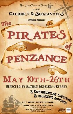 This hilarious comic opera is packed full of sentimental pirates, blundering policemen, absurd adventures, and improbable paradoxes. Frederic, a pirate’s apprentice, falls head-over-heels in love with Mabel, the daughter of Major-General Stanley. Frederic is due to be released from his apprenticeship on his 21st birthday, but there’s a snag. Born on the 29th of February, Frederic discovers that he is technically still a youngster. Although very much in love, his dedication to duty is unshakeable. Can he find a way to live happily-ever-after with Mabel? Featuring such memorable songs as the tongue-twisting ‘I Am the Very Model of a Modern Major-General’, and beloved since its premiere in 1879, The Pirates of Penzance is a delightful farce of a classic that is fun for all ages! Showing May 10 through 26, don’t miss this delightful SJCT production, packed with swashbuckling adventure, rollicking romance, and a few audience surprises! Tickets are $26 for adults, $15 for students, and $5 for student rush tickets. Thursdays are pay-what-you-can admission at the door. To purchase tickets, call our Box Office at 360-378-3210 or visit our website at www.sjctheatre.org. Get tickets now!