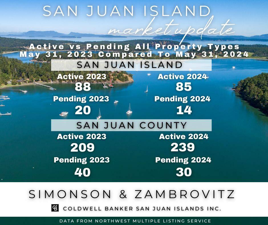 Here is the Market Snap Shot for San Juan Island and the County for May 31, 2024 from the Simonson & Zambrovitz Team at Coldwell Banker SJI. We continue to struggle with the origination of new listings. Therefore, the number in inventory is stagnant. The lack of inventory places downward pressure on the number of pending transactions.