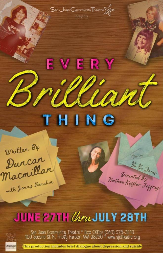 San Juan Community Theatre’s summer show Every Brilliant Thing, starring Boo Boo James, opens June 27! A daughter, now grown, recalls how she created a list of things worth living for, all in an attempt to raise the spirits of her chronically depressed mother. Duncan MacMillan’s play explores the lengths we go for those we love through the eyes of a child whose mother suffers from depression. Filled with resounding hope, infectious humor, and surprising warmth, Every Brilliant Thing counts the joys that make living wonderful and celebrates the hope we find in the smallest miracles of life.
