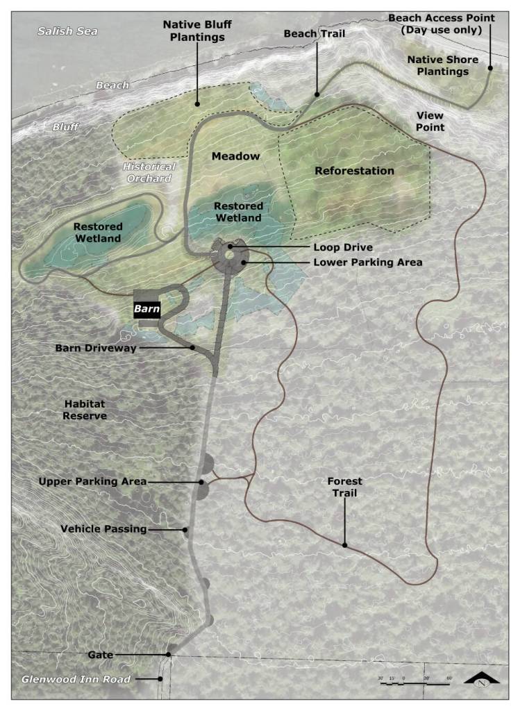 The North Shore Preserve will be managed as a public natural area that provides low-intensity recreational access via forest and beach trails. Around 30 directional signs will help guide pedestrians and interpretative signs will pay homage to early agri-tourism and indigenous history. Roughly 20 acres will be set aside as a habitat reserve and will not be accessible to the public. The beaches to the east and west are private, and there is no overland access to Point Doughty.