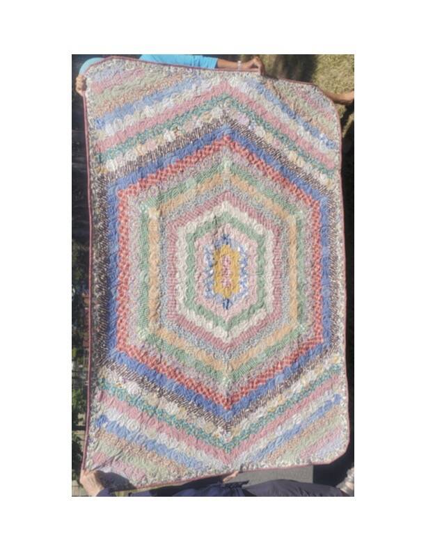 This exceptional quilt was made by Marybell Schuch and was generously donated by her daughter, Nancy Richardson, to support the Rainshadow Quilting Arts Guilds community projects. The quilt top was made during World War II.