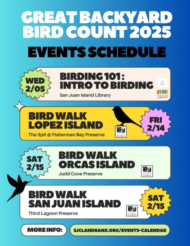 Guided bird walks: Space is limited for bird walks; please register in advance to secure your spot. Email Tanja Williamson at tanjaw@sjclandbank.org or call 360-370-7655.