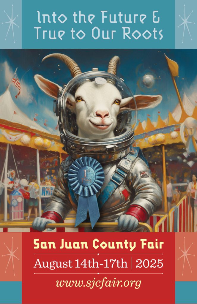 The San Juan County Fair Board selected the poster contest winner for the 2025 Fair in January and received immediate backlash to the Artifical Intelligence artwork. The poster features a goat in a spacesuit surrounded by fair imagery and the 2025 Fair Slogan: “Into the Future & True to Our Roots.”