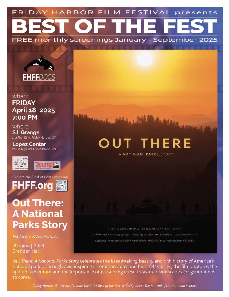 Friday Harbor Film Festival celebrates Earth Day Month and our national parks on Thursday, April 17 at 7 p.m. at Orcas Center’s Center Stage Theater and Friday, April 18 at 7 p.m. at both the San Juan Island Grange and the Lopez Center for Community and the Arts. “Out There: A National Parks Story” is a stunning road trip through our national parks, honoring the people working to maintain their beauty. The documentary will be followed by an exclusive prerecorded Q&A with the director, Brendan Hall. As part of the Earth Day Orcas, in conjunction with the San Juan Islands Makers Guild, there will be additional speakers, including a ranger from the San Juan Islands National Monument. Details are available at fhff.org.