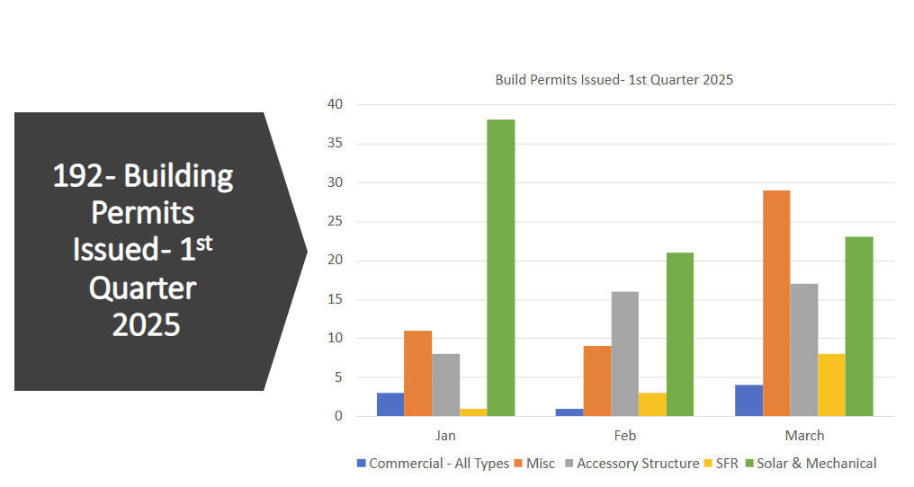 DCD received 230 building permits in the first quarter of 2025 and issued 192. These types of permits include commercial, accessory dwelling units, and solar and mechanical permits. There are approximately 217 pending building permits that require additional information from the applicant or have been routed for review. Permit review times continue to vary, but staff is implementing a “stop clock” to better understand review timeframes.