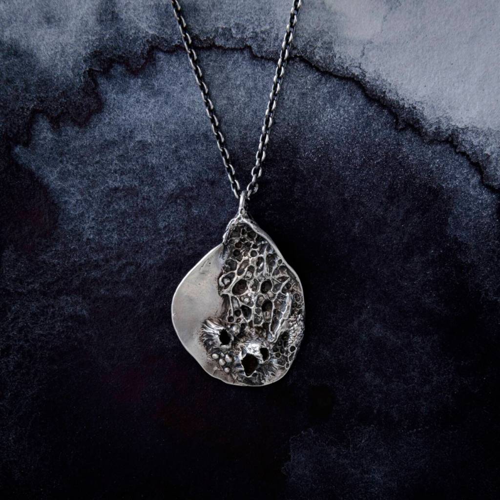 A sterling silver oyster shell, wave-worn, salt-burnished, and imprinted by the tides. Encrusted with textures redolent of untold stories flickering in the perpetual force of ebb and flow. Its bones tangibly altered by the tone and timbre of its lived experience.