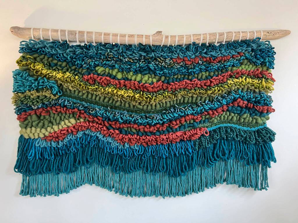 When the inspiration for a new weaving arrives, my heart flutters with anticipation. Unnamed at the time, Graceful Growth was born of July’s beach picnics and gentle waves caressing the shoreline. The shape of the tapestry and color palette flow freely: a gradient from soft turquoise, foamy green to cream.