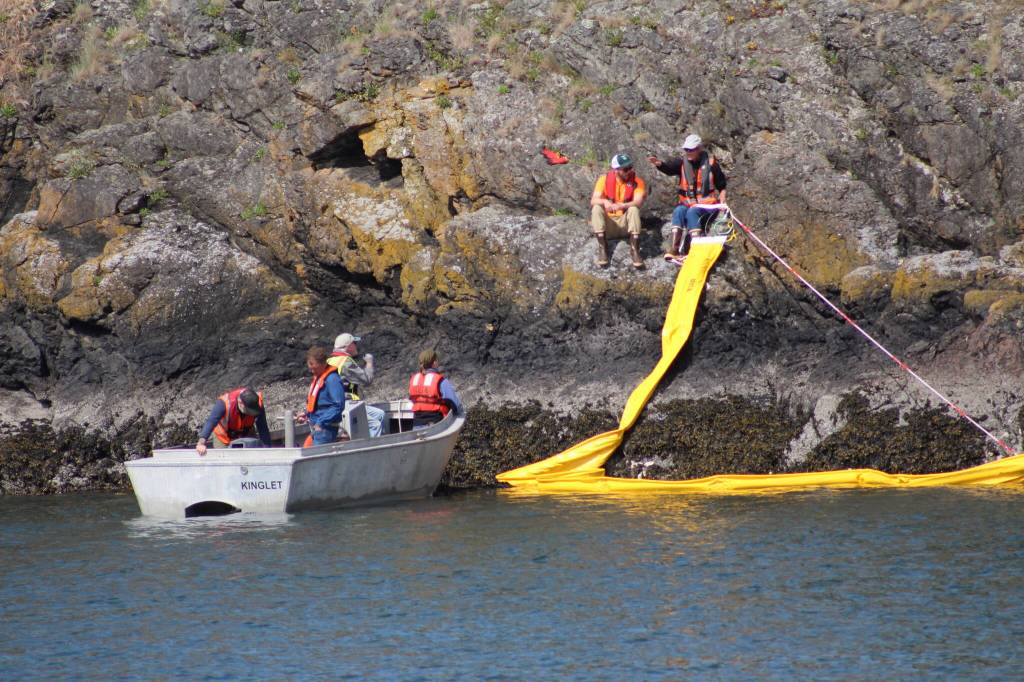 The scenario; begining at 4:30 p.m. on Monday, June 2, a caller reported the presence of numerous “blobs” of heavy oil comming ashore at Fourth of July Beach on San Juan Island, at 4:50 p.m. a report of black oil washing up on Davis Bay, on the south end of Lopez, is received. At 5 p.m., the Port of Friday Harbor contacted the Islands’ Oil Spill Association to report numerous “oiled areas” on Jackson’s Beach, and at 6 p.m., IOSA staff confirmed the reports on Lopez and San Juan, deployed a vessel to the area and reported a number of encounters with recoverable heavy oil floating on the surface between Cattle, Turn and Iceberg points. There were no reports of vessel accidents in the region. U.S. Coast Guard Vessel Traffic Control reported no vessels in the vicinity that would be likely sources of pollution. At 6:45 p.m., IOSA reported finding several seabirds that appeared to be oiled, including one deceased bird.