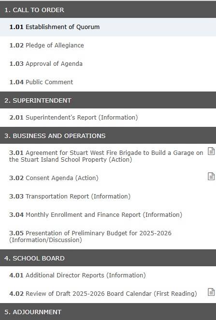 A quick look at the board agenda is provided included for your convenience. Please be aware that the agenda could change prior to the board meeting.