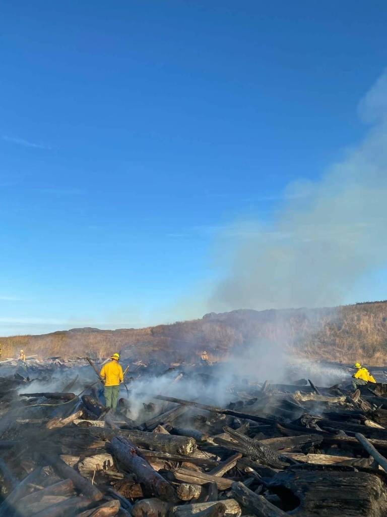 Beginning 10 p.m. July 31, San Juan Fire has been battling a stubborn and dangerous fire at the west cove at South Beach. The fire has embedded into the decades deep log debris requiring fancy footwork and ten’s of thousands of gallons of water.