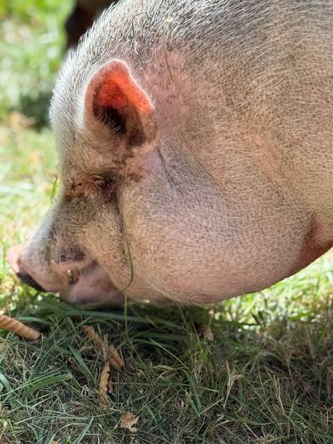 Jethro the pig came from Pasadena. Someone reported a husky in a parked car, and when the rescuers retrieved the husky, they found a very obese Jethro in the car as well. Pigs are susceptible to fat blindness, Cole explained, but he is now down to a good weight, and he is content in his new life outdoors in the breezes with a pair of sister pigs, Hannah and Phylis. Jethro doesn’t wallow like most pigs, rolling about in the mud. Having gotten used to being in a car, Jethro, Cole said, isn’t a fan of getting dirty. Since mud protects pigs’ skin from the sun, Jethro gets sunscreen treatments instead.