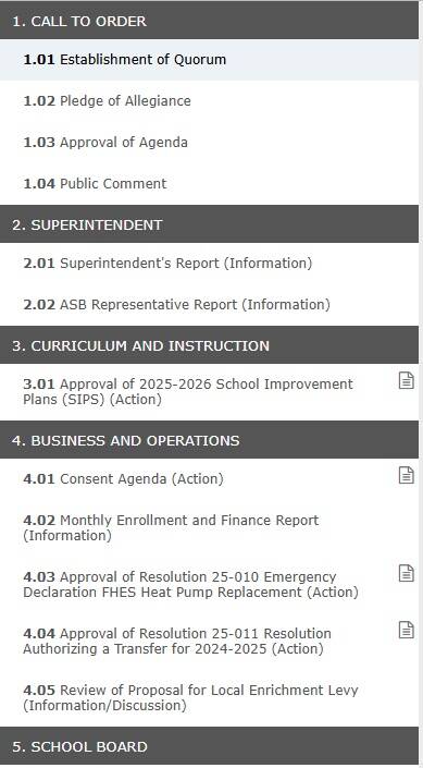 Please note that there is not an option to attend meetings remotely. Persons with disabilities and those who may have difficulty physically attending are encouraged to contact the school district office at 360-378-4133 at least 24 hours before the meetings so that we can arrange for your participation. Please also note that effective June 30, 2024, all regular and special meetings of the board at which a final action is taken or formal public testimony is accepted, except executive sessions or emergency meetings, will be audio recorded and such recordings will be maintained for at least one year. Audio recordings of past meetings can be found here.